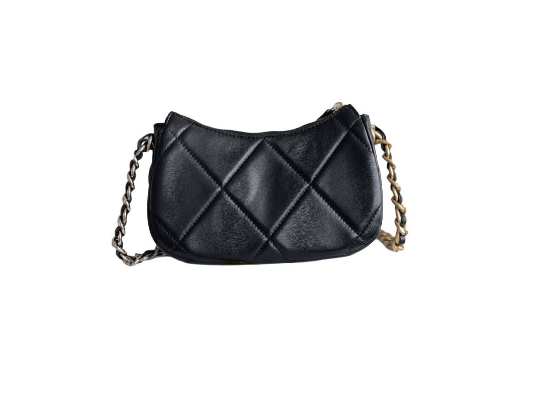 The Chanel 19 Clutch (2025 model) is crafted from shiny black lambskin and finished with gold, silver, and ruthenium-finish metal hardware. The blend of polished leather and tri-tone metal gives this bag a modern, luxurious look. With the iconic CC logo and a refined, compact design, it's the perfect evening bag.